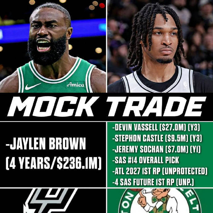 北京时间2025年6月20日,美媒给出了有关杰伦-布朗的交易方案。具体如下:
